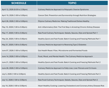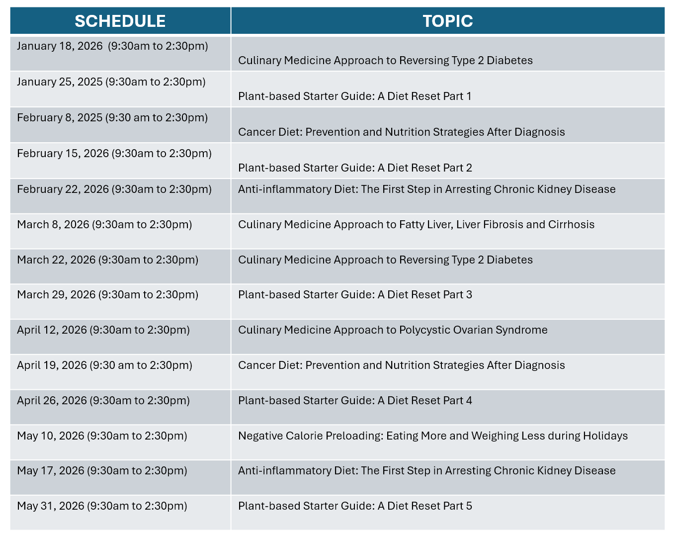 Culinary Medicine workshop will complement your theoretical knowledge that is centered around seven pillars for food preparation: whole, fresh, seasonal, traditional, local, balanced, and delicious.