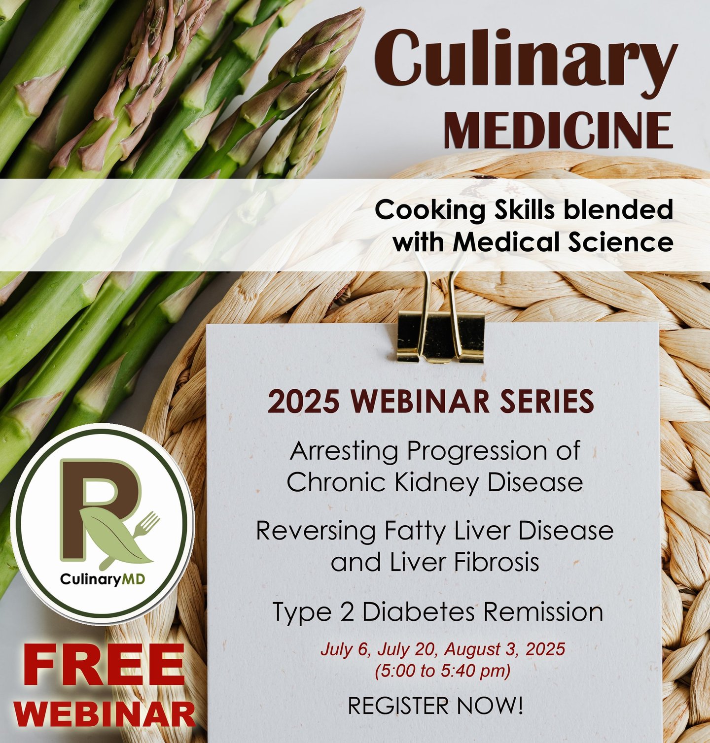 Join us for a free webinar on culinary medicine and discover how you can enhance your health and overall well-being through the preparation of food. This informative session will provide you with valuable insights on the relationship between nutrition and wellness, and how simple changes in cooking techniques and ingredients can have a significant impact on your health.